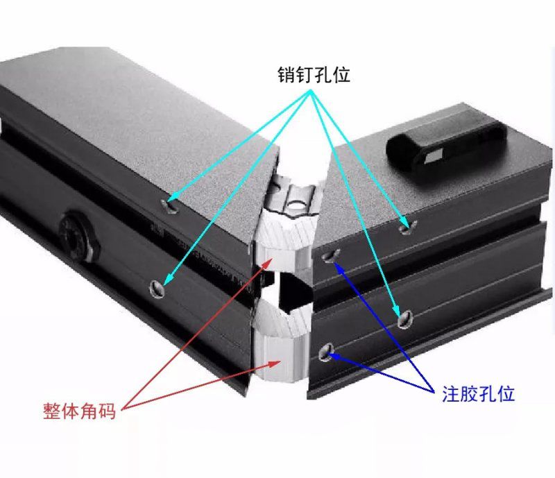 销钉注胶实际上是两个不同的概念。销钉是一个附件,而注胶是一个工艺流程。要理解这两个概念,首先要普及窗户的连接和紧固方法。窗框和窗扇由四个侧面组成,四个侧面型材的连接紧固件称为角码(一些小型和低端加工厂使用螺纹连接)。
